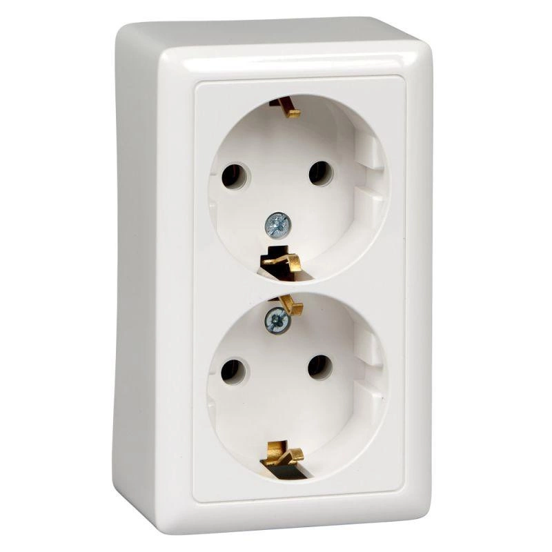 Розетка Schneider Electric ХИТ (открытой установки, цвет белый) двойная с заземлением без шторок предназначена для сетей до 250 В на ток до 16 А.