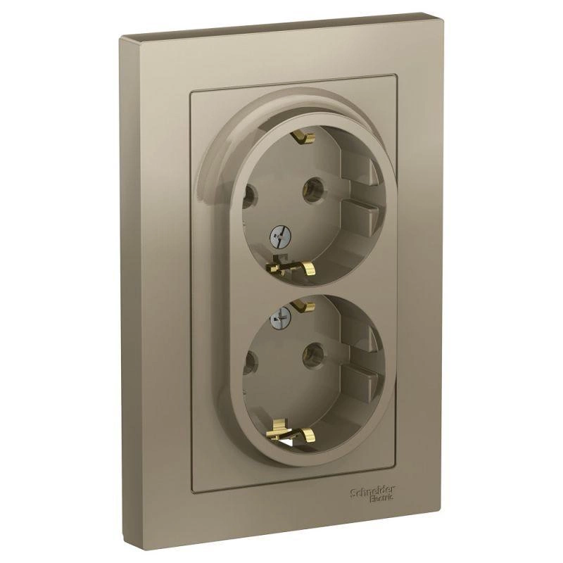 Розетка двойная Schneider Electric AtlasDesign (в сборе, цвет шампань) с заземлением, без шторок подходит для сетей 250 В, на ток 16 А.