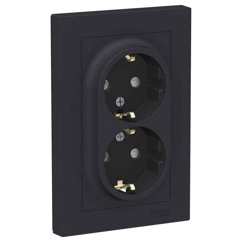 Розетка двойная Schneider Electric AtlasDesign (в сборе, цвет карбон) с заземлением и шторками подходит для сетей 250 В, на ток 16 А.