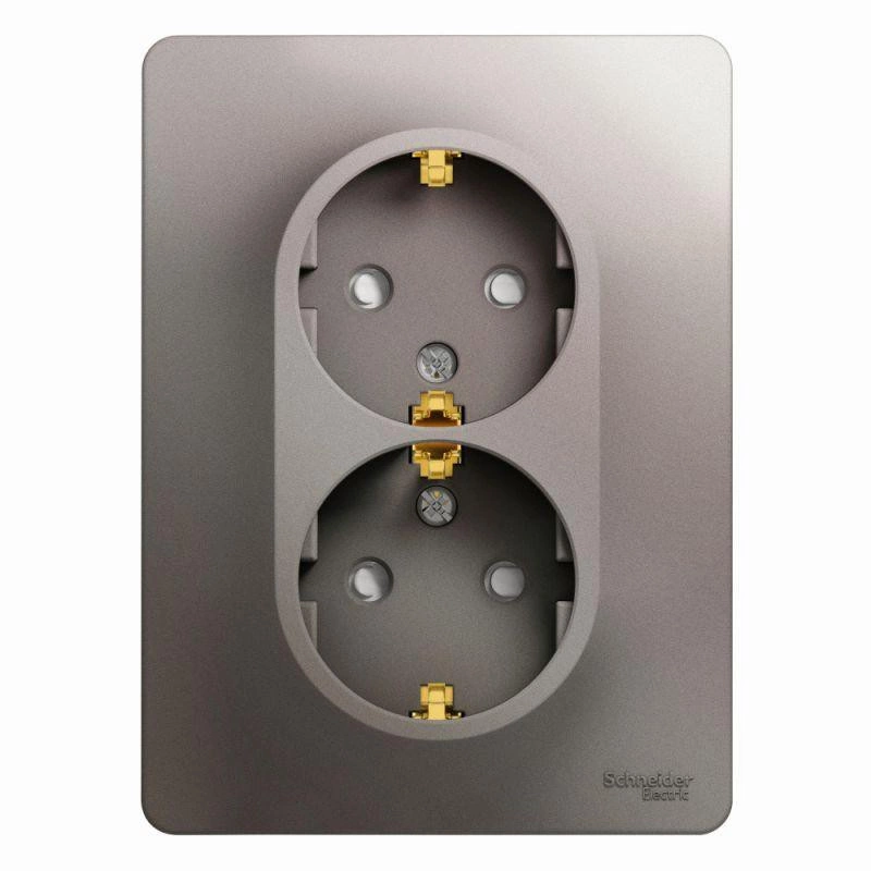 Розетка двойная Schneider Electric Glossa (в сборе, цвет платина) с заземлением и шторками подходит для сетей 250 В, на ток 16 А.