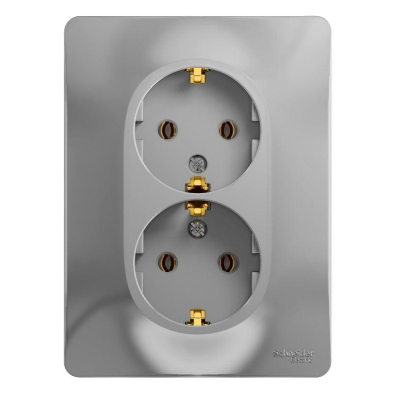Розетка двойная Schneider Electric Glossa (в сборе, цвет алюминий) с заземлением, без шторок подходит для сетей 250 В, на ток 16 А.