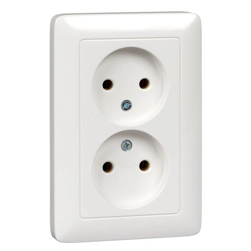Розетка Schneider Electric ХИТ (скрытой установки, цвет белый) двойная без заземления и без шторок предназначена для сетей до 250 В на ток до 10 А.