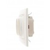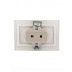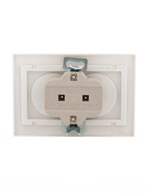 Корпус представляет собой форму из негорючего пластика, белого цвета, с защитными шторками, автоматически закрывающими гнезда розетки при вынутой вилке. Основание керамическое. Подпружиненные лапки крепления обеспечивают комфортный и легкий монтаж изделия. Предусмотрена возможность установки без применения монтажной коробки.