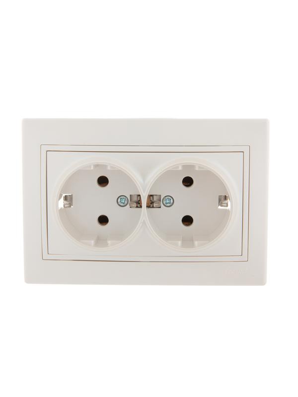 Корпус представляет собой форму из негорючего пластика, белого цвета, с защитными шторками, автоматически закрывающими гнезда розетки при вынутой вилке. Основание керамическое. Подпружиненные лапки крепления обеспечивают комфортный и легкий монтаж изделия. Предусмотрена возможность установки без применения монтажной коробки.