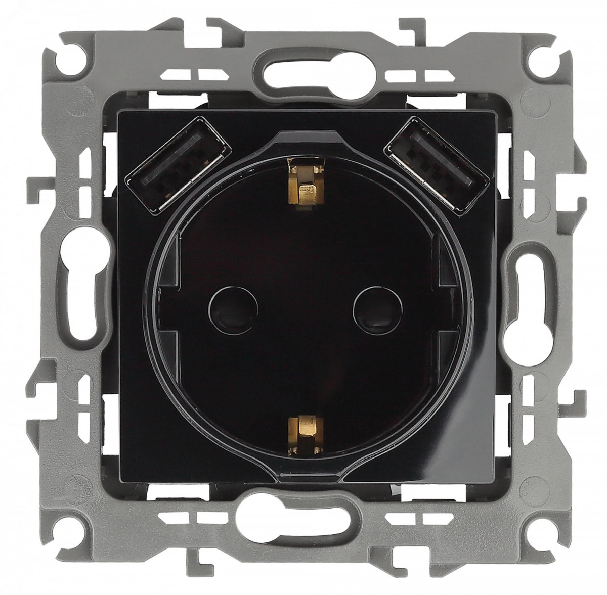 Розетка 2P+E 16A-250В, штор. с 2xUSB 5В-3А, Эра12, чёрный (10/100/2000) 12-4109-06