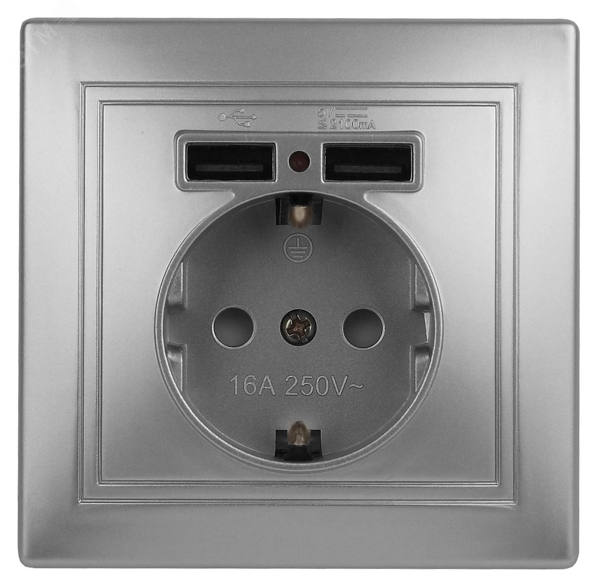 Розетка 2P+E Schuko со шторками с заземлением , 16А-250В + 2хUSB 5В-2,1А, IP20, СУ, алюминий, Intro Plano 1-410-03