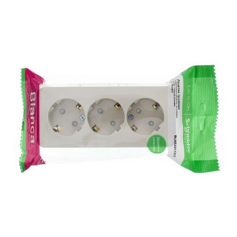Розетка Schneider Electric BLANCA (открытой установки, цвет бежевый) трёхместная с заземлением и шторками, с изолирующей пластиной подходит для сетей 250 В, на ток 16 А.