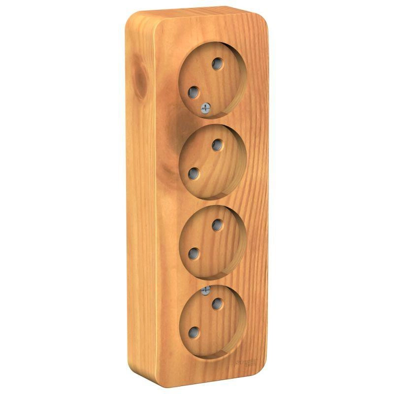 Розетка Schneider Electric BLANCA (ясень, открытой установки) четырехместная, без шторок и заземления, с изолирующей пластиной предназначена для сетей до 250В, на ток до 16А. четырехместная розетка позволяет подключить четыре устройства в одном месте. Изделия цвета Ясень обладают уникальным рисунком, напоминающим древесный сруб. Она изготовлена из ABS-пластика, проста в установке и удобна в применении.