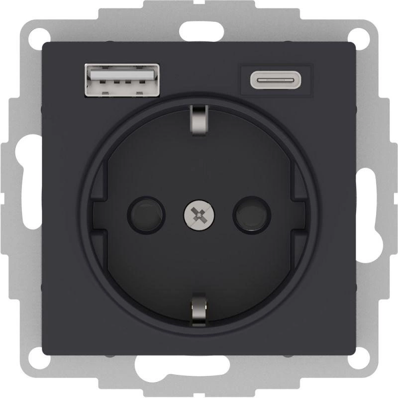 Полное описание: Розетка AtlasDesign 16А с 2-мя заряд. устройствами USB тип A+C 5В/2.4А 2х5В/1.2А механизм карбон SchE ATN001032