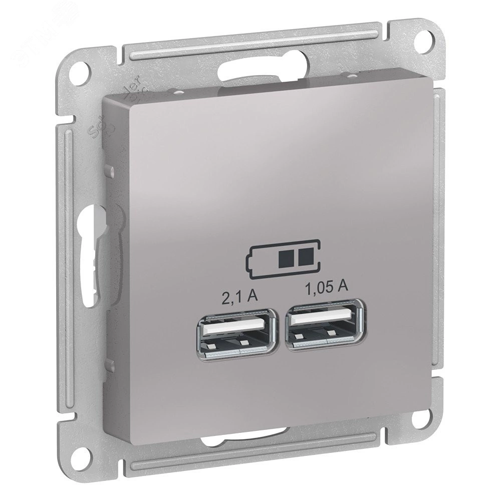 Механизм Schneider Electric AtlasDesign (цвет алюминий) розетки для зарядки с двумя разъёмами USB с выходными напряжением 5 В постоянного тока и выходами с номинальным током по 2,1 А. USB розетка позволяет напрямую заряжать одно или два мобильных устройства. Лицевые детали из качественного ABS-пластика, устойчивого к царапинам и УФ-излучению. Усиленные прямые монтажные лапки для лучшей фиксации механизма в монтажной коробке.