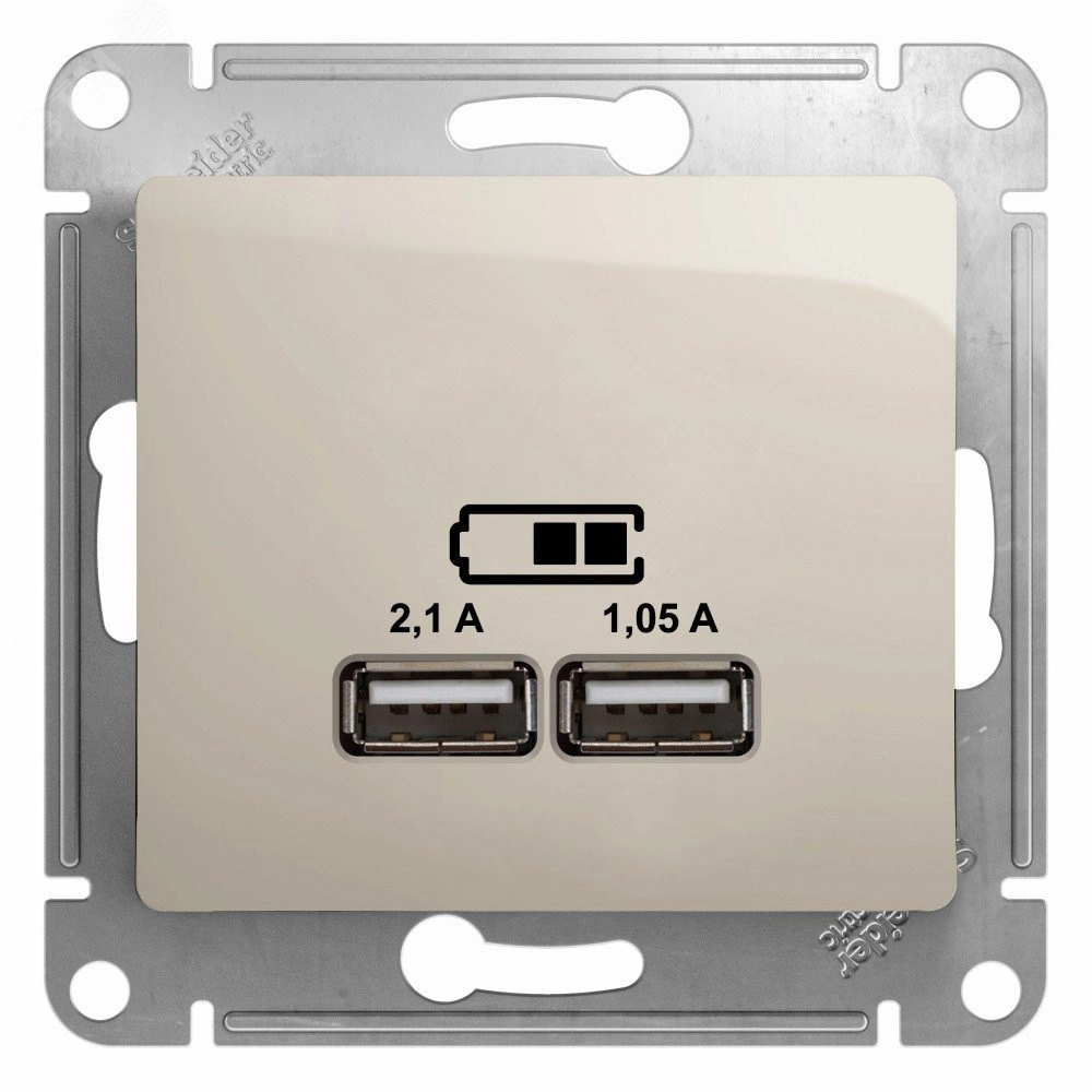 Механизм Systeme Electric (ранее Schneider Electric) серии Glossa (цвет молочный) розетки с двумя разъёмами USB с выходными напряжением 5 В постоянного тока и выходами с номинальным током по 2,1 А. Предназначен для зарядки мобильных устройств - телефоны, планшетные компьютеры, mp3/mp4 плееры. Может заряжать одно или два устройства одновременно. Выполнен из материала PС+ASA, стойкого к УФ-излучению и появлению царапин.