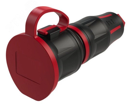 Розетка кабельная 16A/250V/2P+E/IP54 с крышкой, корпус черный, крышка и маркер красный. Двухкомпонентное исполнение (корпус TPE, контактная группа PA6). Кабельный ввод с защитой от изломов (мембранное уплотнение).
