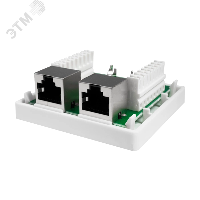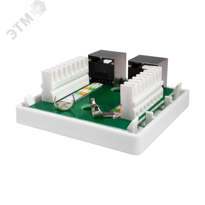 Экранированная компьютерная розетка настенного монтажа. Соответствует характеристикам категории 5е. Имеет 2 порта RJ-45 (8р8с). На печатной плате установлены контакты типа Dual IDC с цветной маркировкой по двум стандартам - T568 А и B. Ножи контактов располагаются под 45°, что лучше сказывается на передаточных характеристиках разъема. Для заделки проводников подходят ножи тип 110 и Krone. Для фиксации экрана кабеля предусмотрены специальные металлические зажимы. В комплект розетки входит двусторонняя клеевая площадка и винты для крепления к стене.