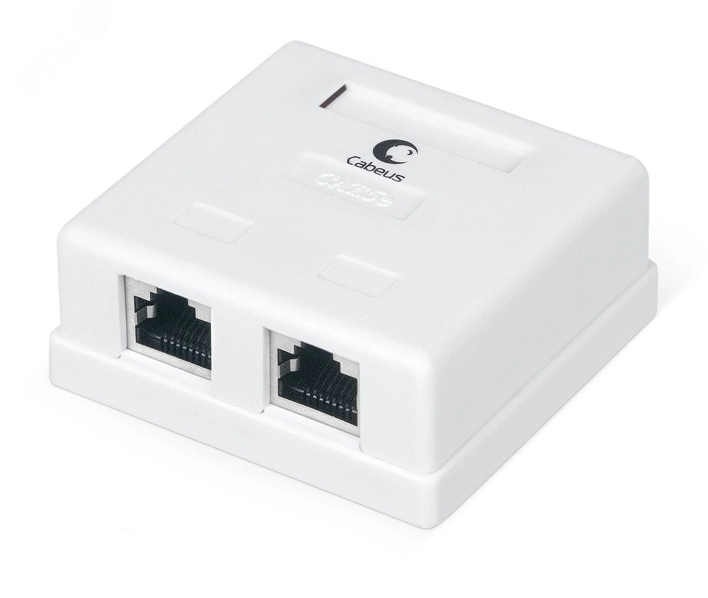 Экранированная компьютерная розетка настенного монтажа. Соответствует характеристикам категории 5е. Имеет 2 порта RJ-45 (8р8с). На печатной плате установлены контакты типа Dual IDC с цветной маркировкой по двум стандартам - T568 А и B. Ножи контактов располагаются под 45, что лучше сказывается на передаточных характеристиках разъема. Для заделки проводников подходят ножи тип 110 и Krone. В комплект розетки входит двусторонняя клеевая площадка, винты для крепления к стене и стяжки для фиксации кабелей в розетке.