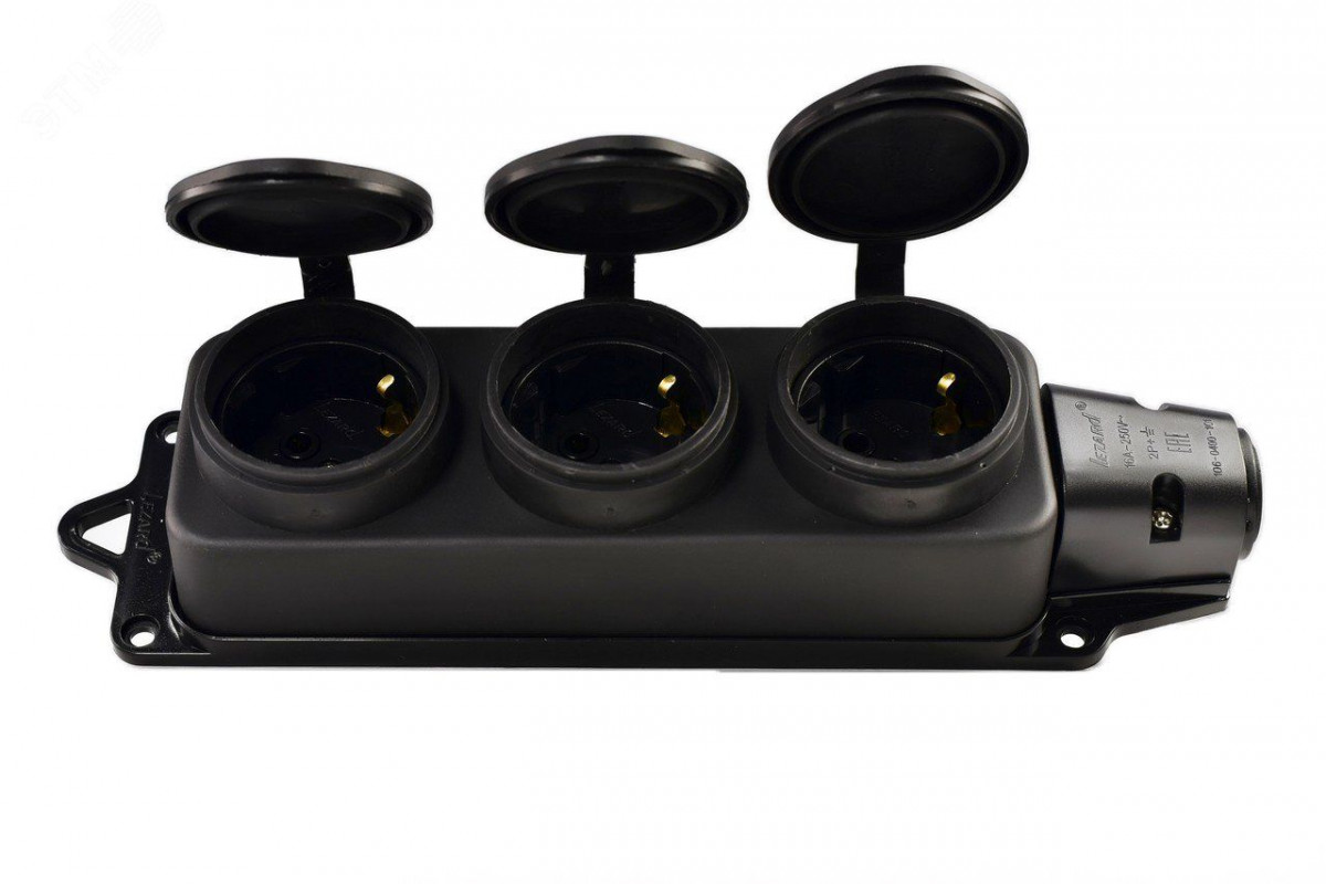 Колодка (розетка) каучуковая с заземлением предназначена для создания точки подключения к электрической сети. Используется для стационарной установки, а также для мобильного (передвижного использования). Позволяет подключать до трех приборов одновременно с суммарным током потребления 16А (3500Вт) (к сети 220В-250В / 50Гц). Колодка имеет кабельный ввод и каждое гнездо закрывается защитной крышкой, что позволяет обеспечить степень защиты IP44 даже в нерабочем положении. Колодка изготовлена из качественного каучука, что гарантирует высокую ударопрочность, безопасность и надежность в процессе эксплуатации.