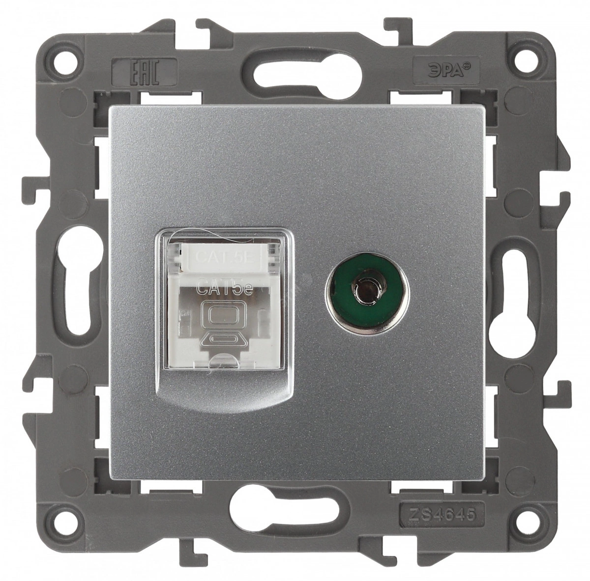 Розетка телевизионная + интернет серии Эра Elegance цвет алюминий 14-3110-03. Рамки приобретаются отдельно. Рамки Эра Elegance ПЛАСТИК: 1 пост 14-5001-хх, 2 поста 14-5002-хх, 3 поста 14-5003-хх, 4 поста 14-5004-хх, 5 постов 14-5005-хх, СТЕКЛО: 1 пост 14-5101-хх, 2 поста 14-5102-хх, 3 поста 14-5103-хх, 4 поста 14-5104-хх, МЕТАЛЛ: 1 пост 14-5201-хх, 2 поста 14-5202-хх, 3 поста 14-5203-хх, 4 поста 14-5204-хх, ДЕРЕВО: 1 пост 14-5301-хх, 2 поста 14-5302-хх, 3 поста 14-5303-хх, 4 поста 14-5304-хх (хх - код цвета: 00-прозрачный, 01-белый, белёный дуб, 02-слоновая кость, 03-алюминий, 04-шампань, 05-чёрный, чёрное дерево, 07-ясень, 09-дуб, 10-венге, 11-клён, 14-медь, 21-жёлтый, 22-оранжевый, 23-красный, 25-бордо, 26-лайм, 27-зелёный, 28-голубой, 29-синий, 30-розовый, 31-мокко, 32-серый, 41-сталь, 42-титан).