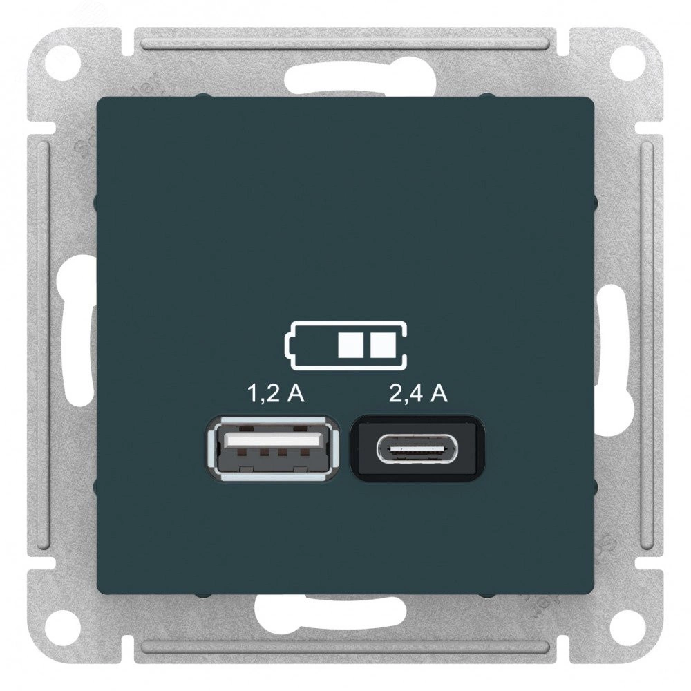 Розетка Schneider Electric AtlasDesign (цвет изумруд) двойная USB с разъемами типа A+C. Лицевые детали из качественного ABS-пластика, устойчивого к царапинам и УФ-излучению. Самая современная USB-зарядка с двумя разъемами позволяет заряжать как стандартные мобильные устройства через разъем типа А, так и новейшие устройства, в том числе ноутбуки, с разъемом типа С.