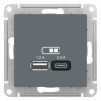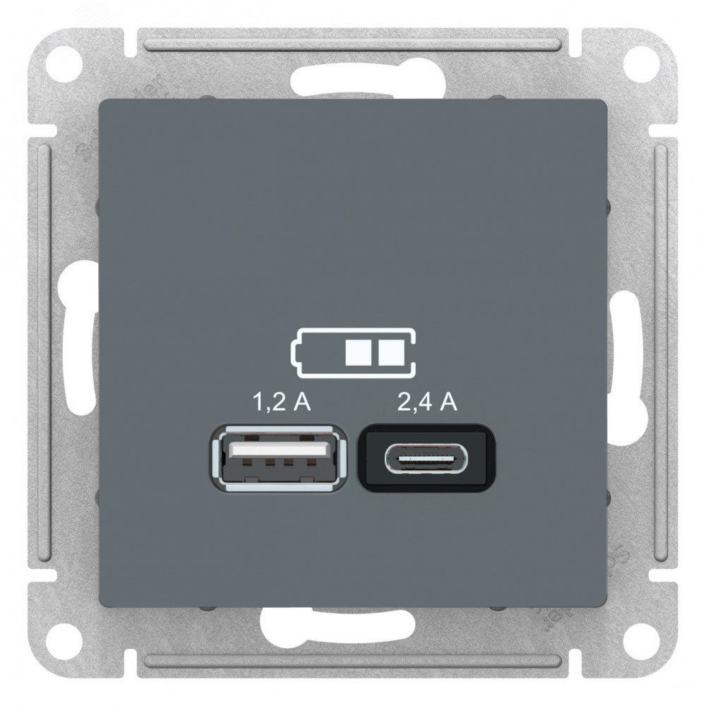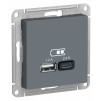 Розетка Schneider Electric AtlasDesign (цвет грифель) двойная USB с разъемами типа A+C. Лицевые детали из качественного ABS-пластика, устойчивого к царапинам и УФ-излучению. Самая современная USB-зарядка с двумя разъемами позволяет заряжать как стандартные мобильные устройства через разъем типа А, так и новейшие устройства, в том числе ноутбуки, с разъемом типа С.