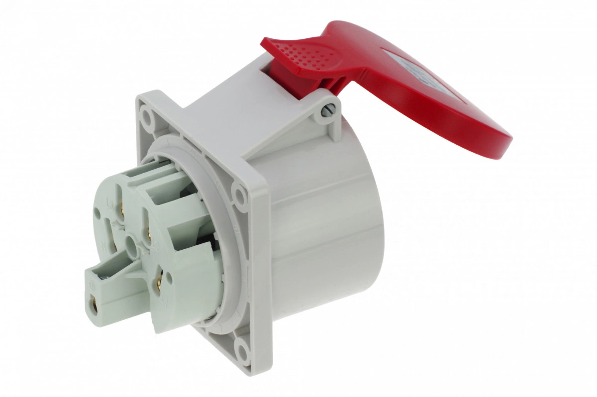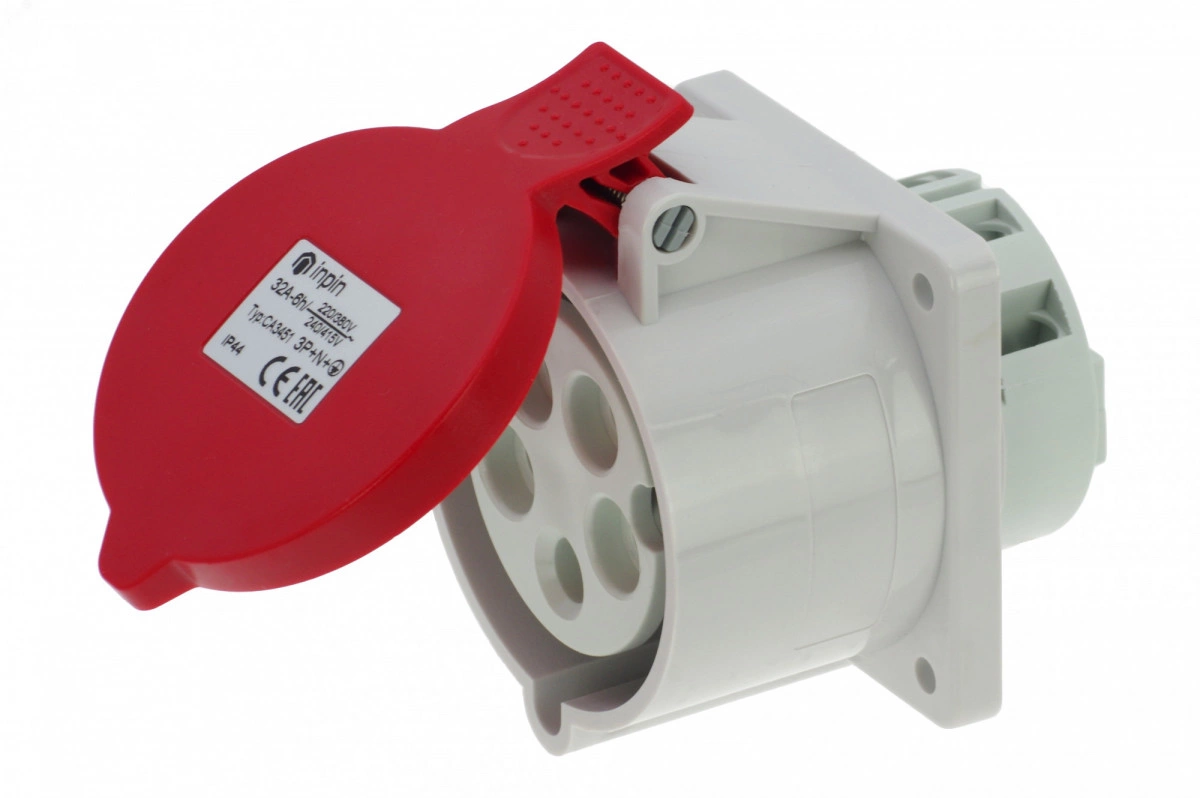 Розетка встраиваемая 32A/400V/3P+N+E/IP44, фланец 75x75, имеет винтовые контакты, выполнены из латуни. Корпус выполнен из полиамида