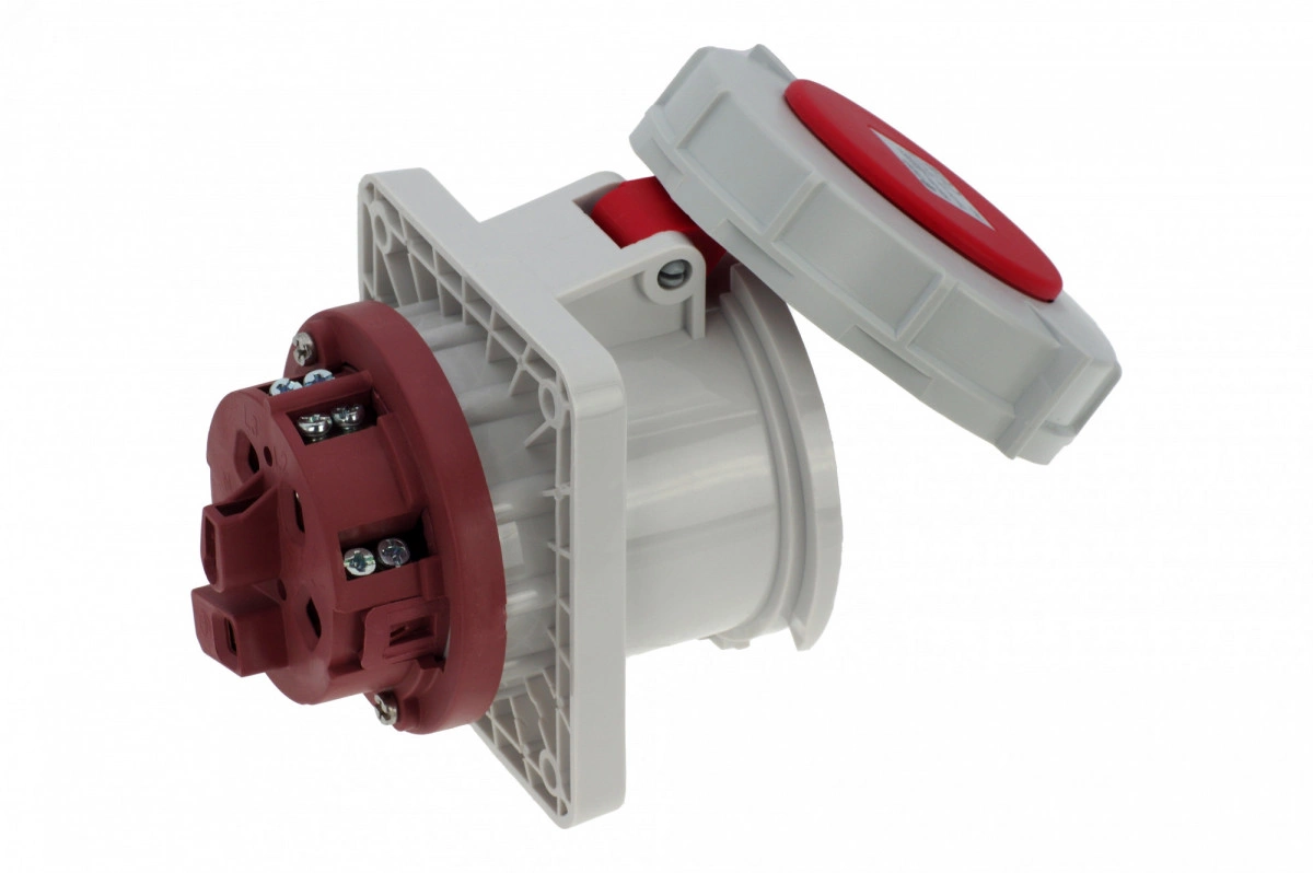 Розетка встраиваемая 63A/400V/3P+N+E/IP67, фланец 100x107, имеет винтовые контакты, выполнены из латуни. Корпус выполнен из полиамида