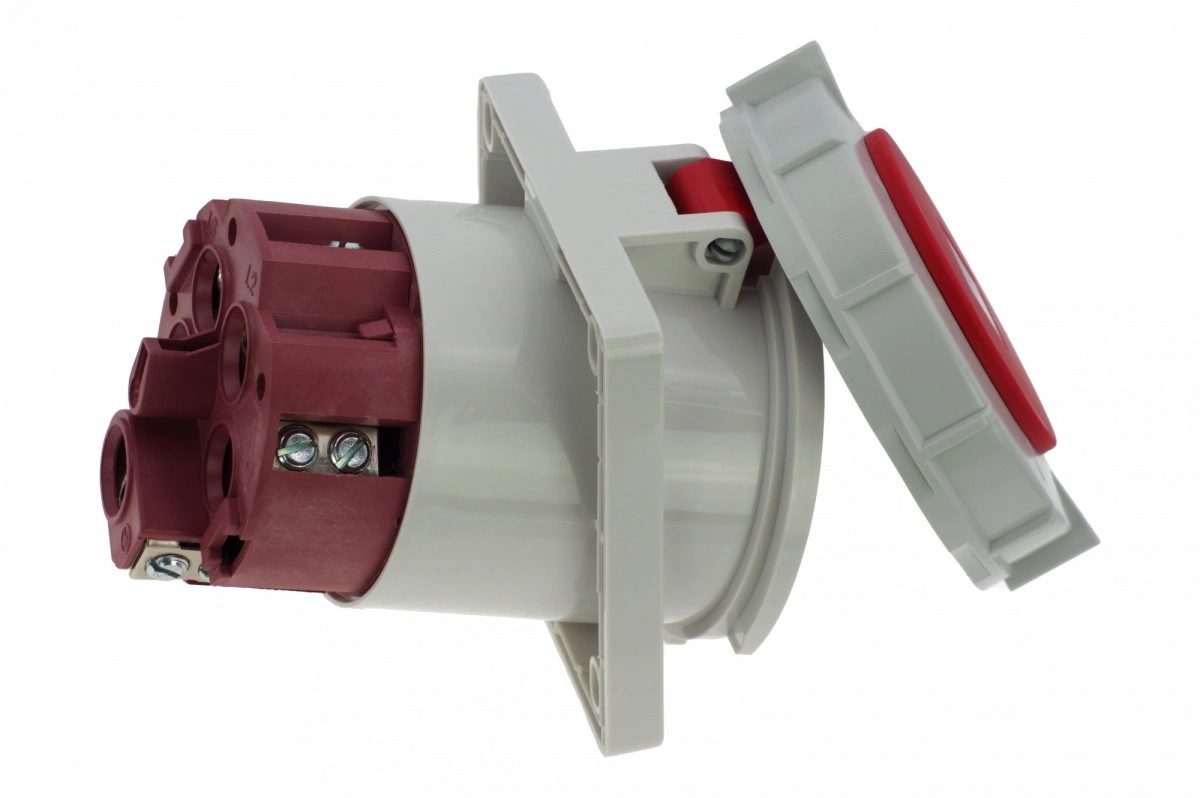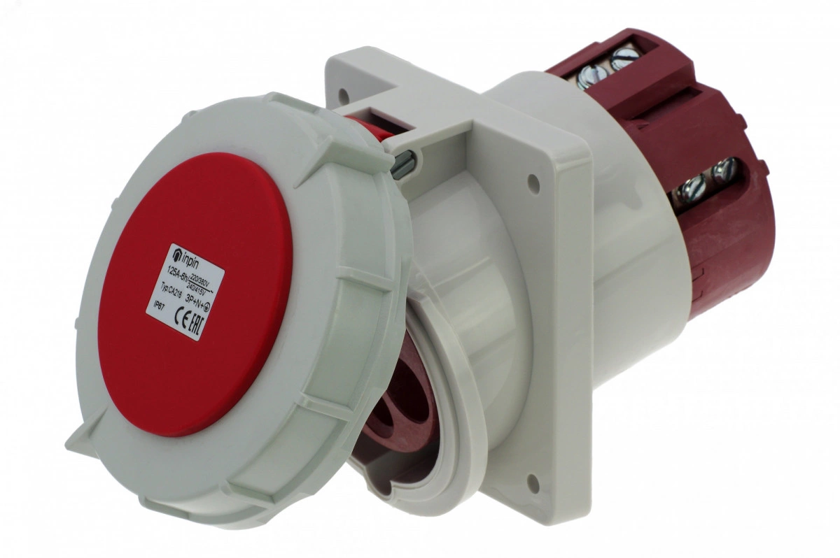 Розетка встраиваемая наклонная 125A/400V/3P+N+E/IP67, фланец 110x114, имеет винтовые контакты, выполнены из латуни. Корпус выполнен из полиамида