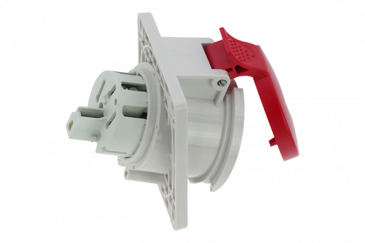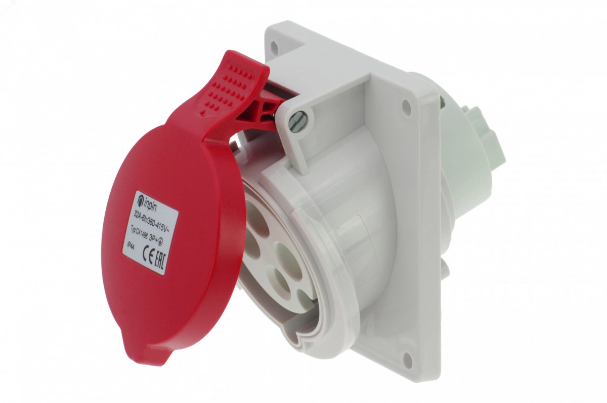 Розетка встраиваемая наклонная 32A/400V/3P+E/IP44, фланец 92x100, имеет винтовые контакты, выполнены из латуни. Корпус выполнен из полиамида