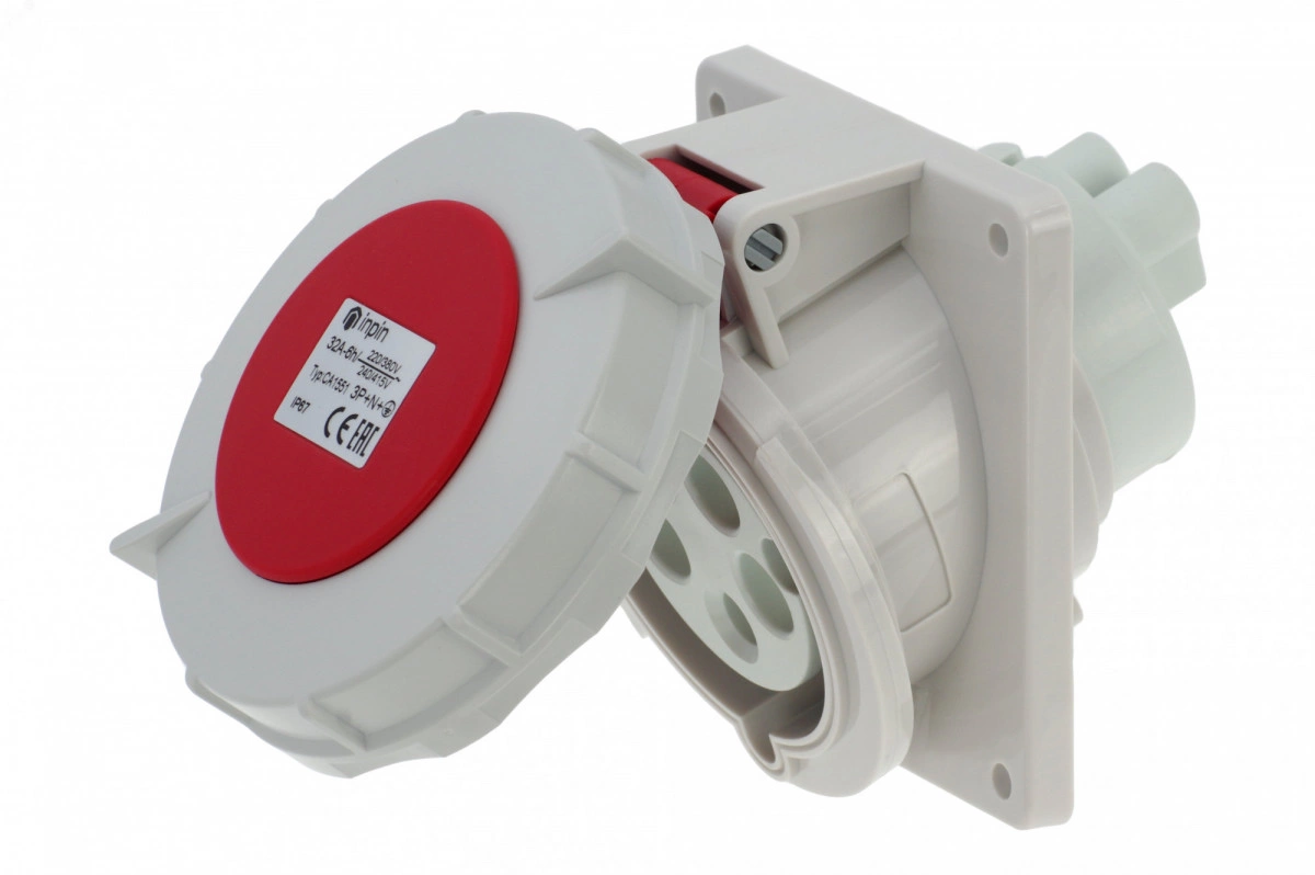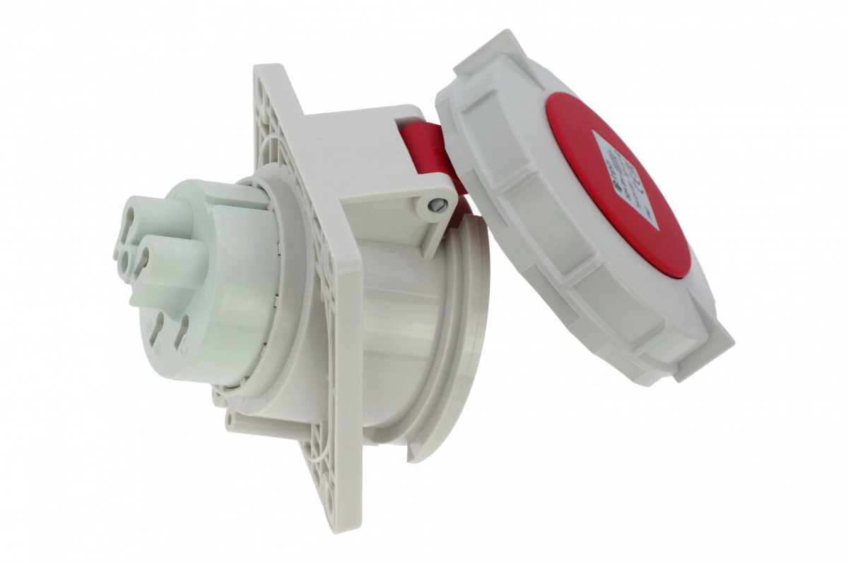 Розетка встраиваемая наклонная 32A/400V/3P+N+E/IP67, фланец 92x100, имеет винтовые контакты, выполнены из латуни. Корпус выполнен из полиамида