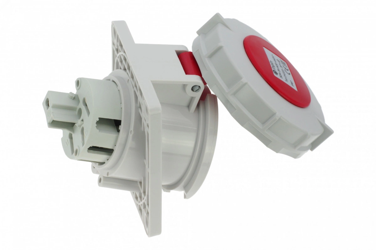 Розетка встраиваемая наклонная контейнерная 32A/400V/3P+E/IP67/3h, никель. конт., имеет винтовые контакты. Корпус выполнен из полиамида