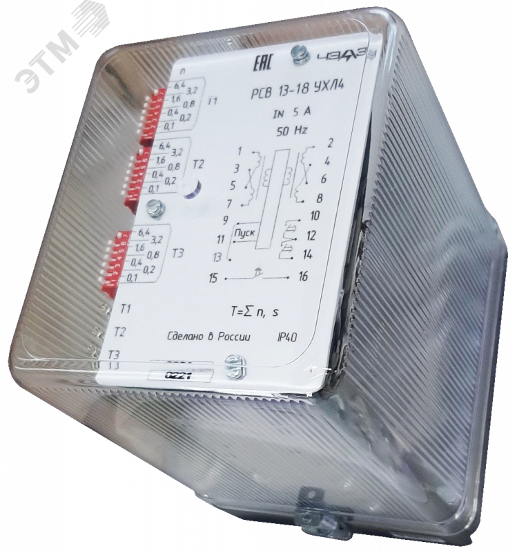 Реле времени токовое РСВ 13-18 статическое (ТУ16-89 ИГФР.647464.005ТУ) серии РСВ-13 предназначено для применения в схемах защиты стационарных систем и объектов на переменном оперативном токе с целью получения регулируемых выдержек времени и включается непосредственно во вторичные цепи измерительных трансформаторов тока. Минимальный ток срабатывания реле РСВ 13-18 соответственно для номинального тока 5А (в зависимости от способа соединения секций первичной обмотки трансформатора - последовательно или параллельно) составляет  2,5, 5 А. Реле РСВ 13-18 выполнено с использованием современной микроэлектронной базы. Элементы схемы РСВ 13-18 установлены на печатных платах, которые размещены внутри корпуса, состоящего из основания (цоколя) и съемного прозрачного кожуха. Диапазон рабочих температур окружающего реле времени РСВ 13-18 воздуха от минус 40 до плюс 55 градусов по Цельсию для исполнения УХЛ4 и от минус 10 до плюс 55 градусов по Цельсию для исполнения О4.
