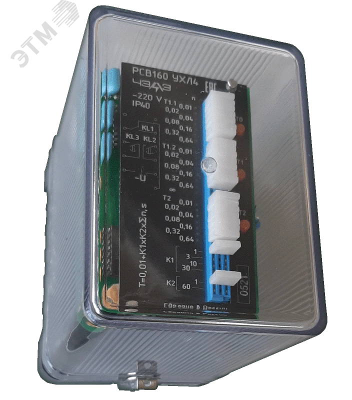 Реле времени статические РСВ 160 предназначены для использования в промышленной аппаратуре различного назначения, для получения выдержек времени в схемах промышленной автоматики и релейной защиты. Реле РСВ160 являются аналогом реле серии РВ100. Диапазон рабочих температур окружающего реле РСВ 160 воздуха от минус 30 до плюс 55 градусов по Цельсию для исполнения УХЛ4 и от минус 10 до плюс 55 градусов по Цельсию для исполнения О4. Группа механического исполнения РСВ-160 - М39 по ГОСТ 17516.1-90, при этом многократные ударные нагрузки длительностью от 2 до 20 ms с максимальным ускорением 3 g. Степень защиты оболочки реле РСВ-160 - IP40, а контактных зажимов для присоединения внешних проводников - IP00 по ГОСТ 14255-69. Реле РСВ160 выполнены с использованием современной микроэлектронной базы. Элементы схемы реле времени РСВ 160 установлены на печатных платах, которые размещены внутри корпуса, состоящего из основания (цоколя) и съемного прозрачного кожуха.