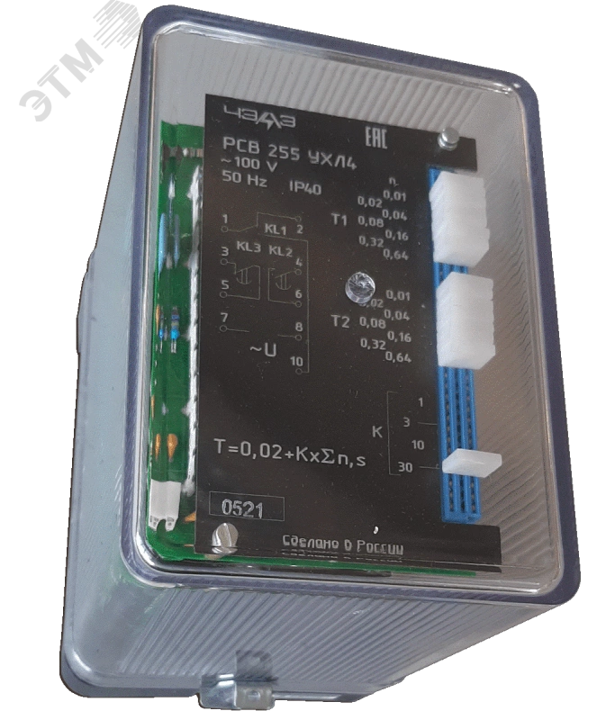 Реле времени статические РСВ 255 предназначены для использования в промышленной аппаратуре различного назначения, для получения выдержек времени в схемах промышленной автоматики и релейной защиты. Реле РСВ255 являются аналогом реле серии РВ200. Диапазон рабочих температур окружающего реле РСВ 255 воздуха от минус 30 до плюс 55 градусов по Цельсию для исполнения УХЛ4 и от минус 10 до плюс 55 градусов по Цельсию для исполнения О4. Группа механического исполнения РСВ-255 - М39 по ГОСТ 17516.1-90, при этом многократные ударные нагрузки длительностью от 2 до 20 ms с максимальным ускорением 3 g. Степень защиты оболочки реле РСВ-255 - IP40, а контактных зажимов для присоединения внешних проводников - IP00 по ГОСТ 14255-69. Реле РСВ255 выполнены с использованием современной микроэлектронной базы. Элементы схемы реле времени РСВ 255 установлены на печатных платах, которые размещены внутри корпуса, состоящего из основания (цоколя) и съемного прозрачного кожуха.