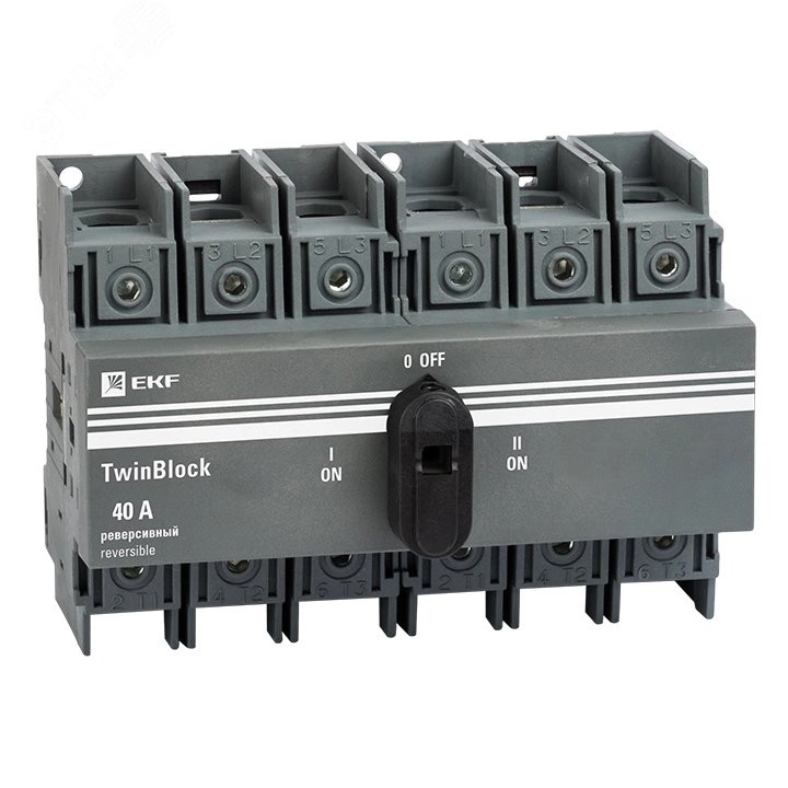 Выключатели-разъединители серии TwinBlock EKF PROxima предназначены для пропускания номинальных токов, включения и отключения электрических цепей номинальным напряжением до 690 В переменного тока частотой 50 и 60 Гц в устройствах распределения электрической энергии. TwinBlock имеют следующие исполнения: 1. С предустановленной рукояткой управления (80 А, 100 А), 2. Без рукоятки управления (рукоятку необходимо приобретать отдельно), 3. Реверсивные (перекидные) рубильники без рукоятки (рукоятку необходимо приобретать отдельно), для моделей без рукоятки предусмотрены два типа рукояток: 3.1. Выносная рукоятка для управления через дверь, 3.2. Рукоятка управления для прямой установки на рубильник. Выключатели-разъединители серии TwinBlock (модели 160-800 А) имеют возможность подключения дополнительного четвертого полюса.
