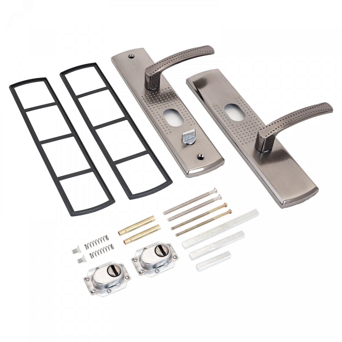 Ручка на планке под цилиндровый механизм. Предназначена для китайских металлических дверей, Подходят для замков автоматического и не автоматического закрывания. Материал - сталь, толщиной 1,1мм, гальваническое покрытие. Межосевое расстояние - 68мм, размеры планки - 70х275мм, длина/высота ручки - 120/19мм соответственно. Цвет ручек и планки - никель. В комплект входят две ручки, винтовые стяжки, пластиковые прокладки и квадратный штырь (8х8мм) 110мм, комплекты стержней для автоматических и не автоматических замков.