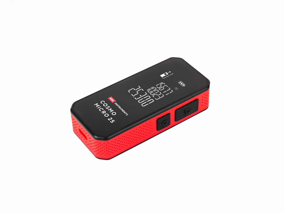 Лазерный дальномер ADA COSMO MICRO 25 самый компактный и удобный дальномер серии COSMO с минимальным набором функций для измерений. Точность и дальность. Лазерный дальномер ADA COSMO MICRO 25 предназначен для измерений дистанций до 25 метров с погрешностью ±3,0 мм. Литиевый аккумулятор. В качестве источника питания используется встроенный литиевый аккумулятор. Заряжать его можно от любого зарядного устройства для смартфона напряжением 5 вольт через разъем USB-C.