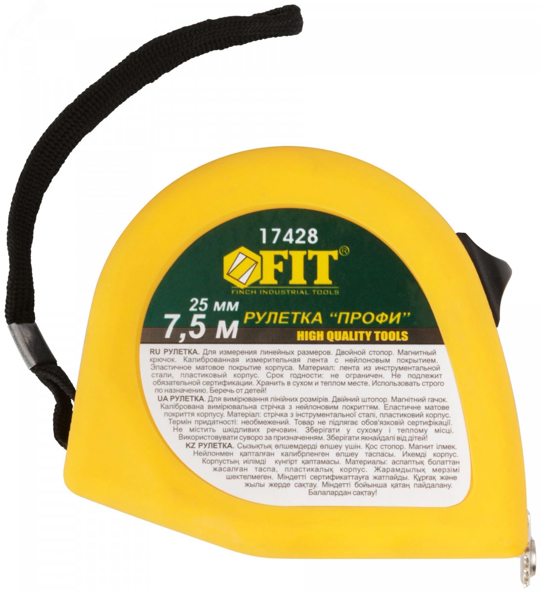 Рулетка ''Профи'' предназначена для измерений линейных размеров. Ленты проходят процесс калибровки и имеют класс точности II. Крупный размер нанесенной шкалы упрощает считывание показаний. Утолщенное полотно обладает высокой прочностью. Корпус рулетки изготовлен из ударопрочного ABS-пластика, устойчивого к механическим воздействиям. Нейлоновое покрытие измерительной ленты защищает шкалу от истирания. Магнитный зацеп упрощает процесс замеров. Рулетку можно крепить на ремне с помощью металлической клипсы. Тканевый ремешок позволяет носить рулетку на руке или хранить в подвешенном положении.