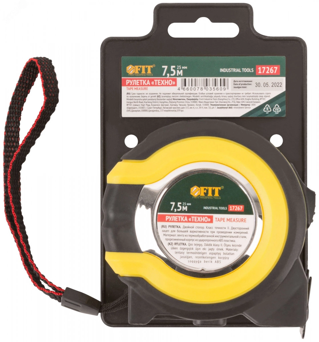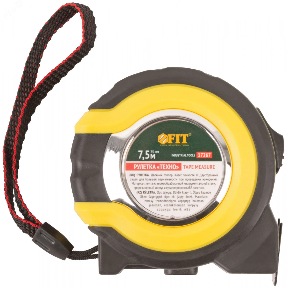 Рулетка ''Техно'' FIT IT предназначена для измерений линейных размеров. Ленты проходят процесс калибровки и имеют класс точности II. Крупный размер нанесенной шкалы упрощает считывание показаний. Утолщенное полотно обладает высокой прочностью. Подвижность зацепа повышает точность измерений. Корпус рулетки изготовлен из ударопрочного ABS-пластика, устойчивого к механическим воздействиям. Резиновые накладки на корпусе предотвращают повреждения инструмента при падении или ударе. Полимерное покрытие измерительной ленты защищает шкалу от истирания. Рулетку можно крепить на ремне с помощью металлической клипсы. Тканевый ремешок позволяет носить рулетку на руке или хранить в подвешенном положении.