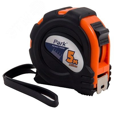 TM28-5025. 5мx25мм. Рулетка Park с одним фиксатором, двухкомпонентный прорезиненный корпус (АБС-пластик (ударопрочный пластик) и термопластичная резина). Материал изготовления - металл, пластик, термопластичная резина. Крючок TRUE ZERO с прорезью для проведения радиусов. Пружина с постоянной жесткостью. Ударопрочный пластик. Упаковка - картонная подложка.