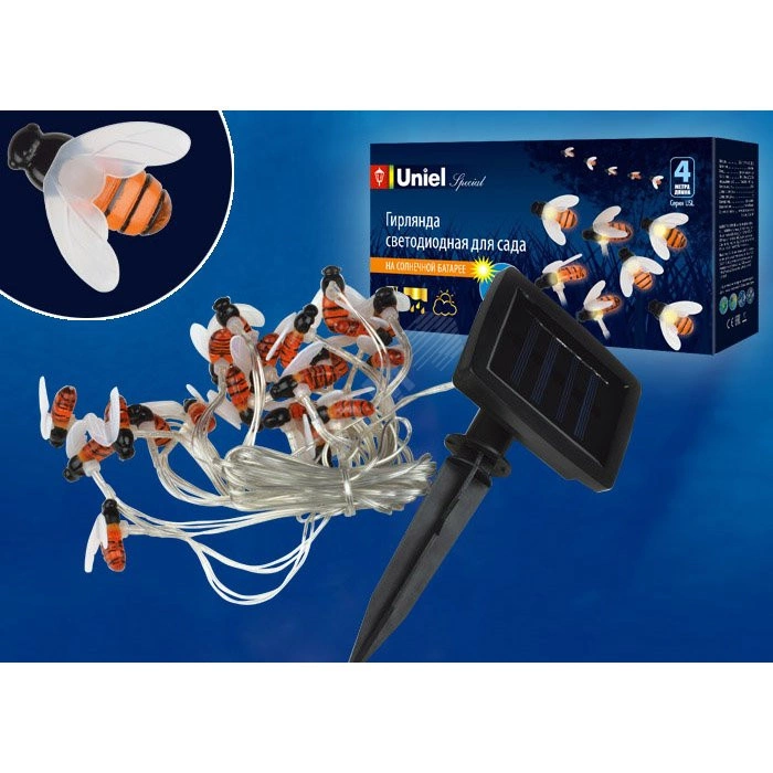 Садовая гирлянда на солнечной батарее ''Пчелки''. 20 светодиодов. USL-S-127/PT4000 BEES Теплый белый свет. 1*АА Ni-Mh аккумулятор в/к. IP44. TM Uniel.