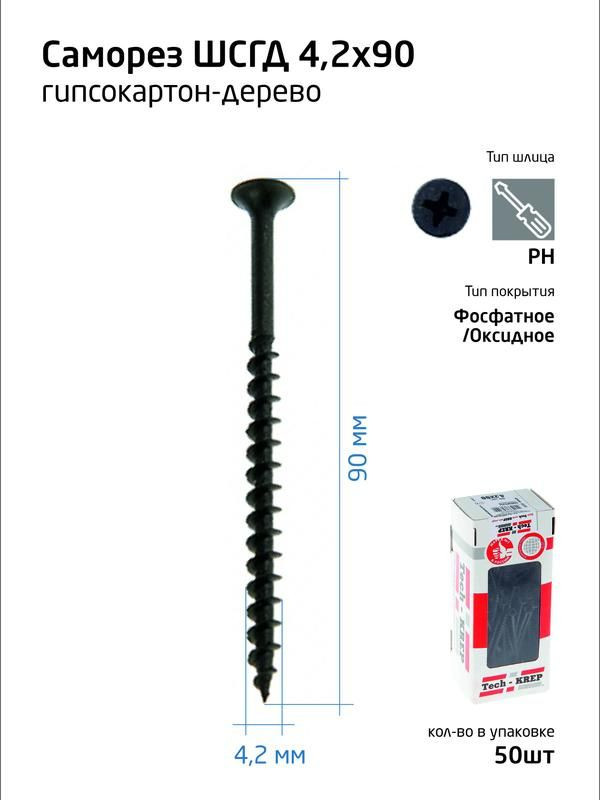 Полное описание: Саморез 4.2х90 гипсокартон-дерево (уп.50шт) коробка Tech-Krep 112219