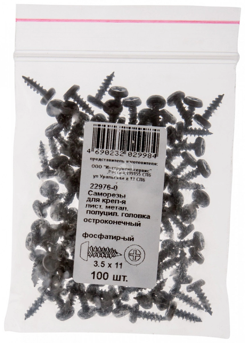 Саморез имеет полусферическую головку с прессшайбой и крестообразным шлицем PH2, полную резьбу с мелким шагом и острый наконечник. Изготовлен из углеродистой стали с антикоррозионным цинковым покрытием.