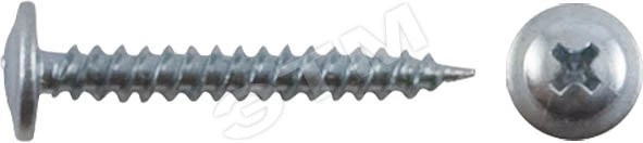 Саморез имеет полусферическую головку с прессшайбой и крестообразным шлицем PH2, полную резьбу с мелким шагом и острый наконечник. Изготовлен из углеродистой стали с антикоррозионным цинковым покрытием.