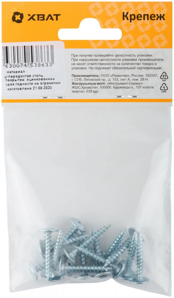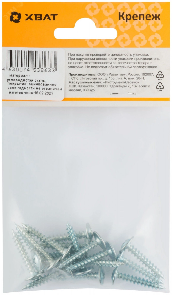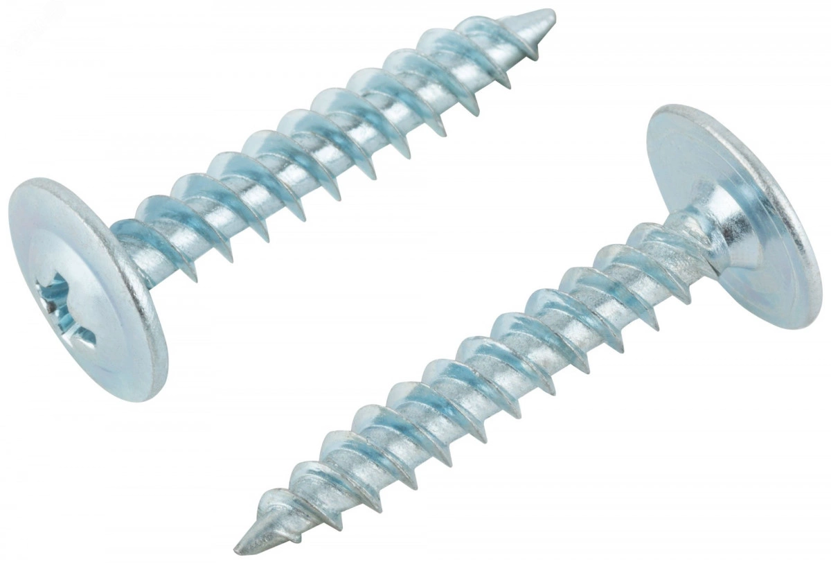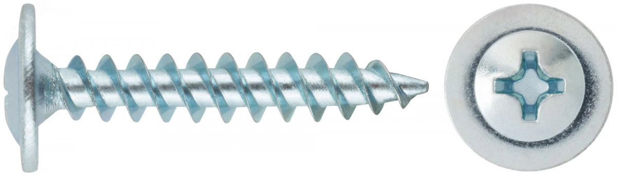 Саморез имеет полусферическую головку с прессшайбой и крестообразным шлицем PH2, полную резьбу с мелким шагом и острый наконечник. Изготовлен из углеродистой стали с антикоррозионным цинковым покрытием.
