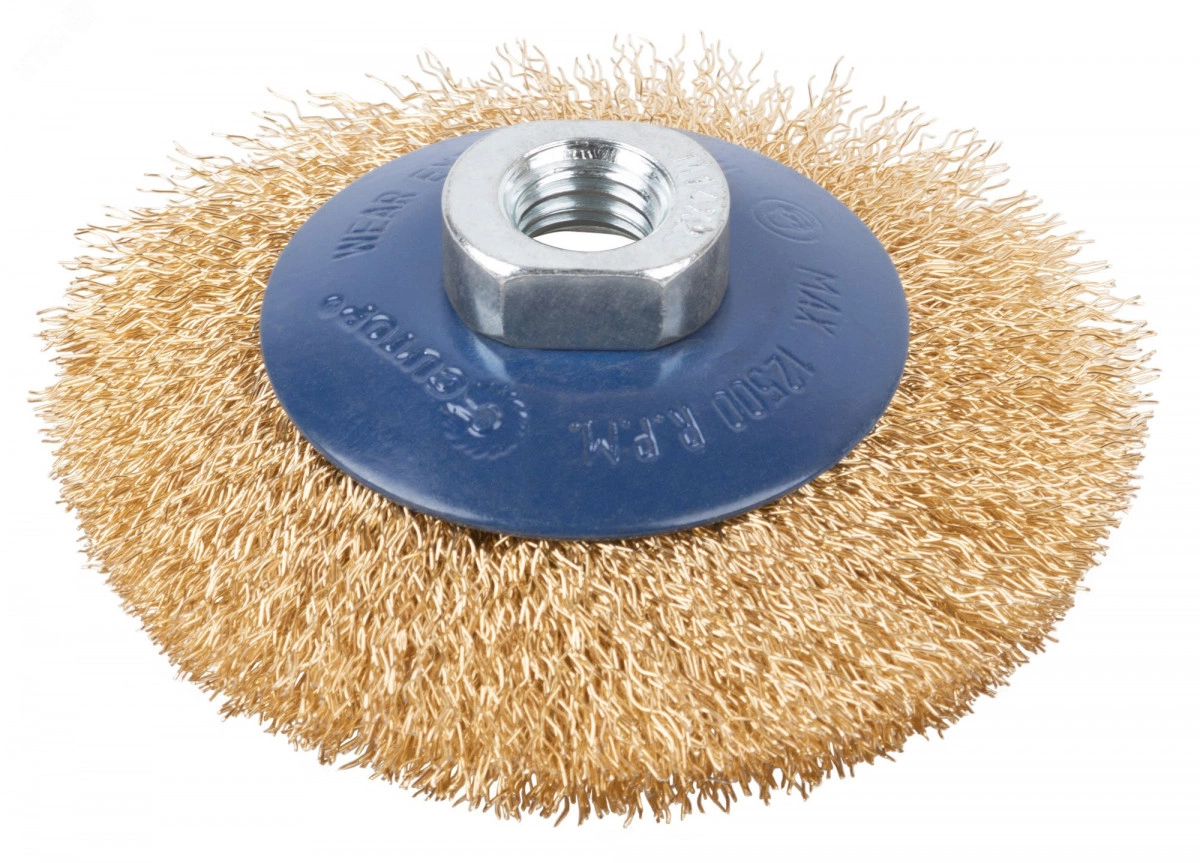 Щетка для УШМ, тип ''Тарелка'', посадка М14. Предназначена для очистки различных металлических и деревянных поверхностей, снятия толстого слоя ржавчины, удаления лакокрасочных покрытий, заусенцев и окалины, обработки сварных швов, различных загрязнений. Тип ''Тарелка'' оптимально подходит для обработки углов, пазов, изгибов и других труднодоступных участков. Щадящая зачистка, латунированная проволока 0,3 мм. Упаковка – блистер.