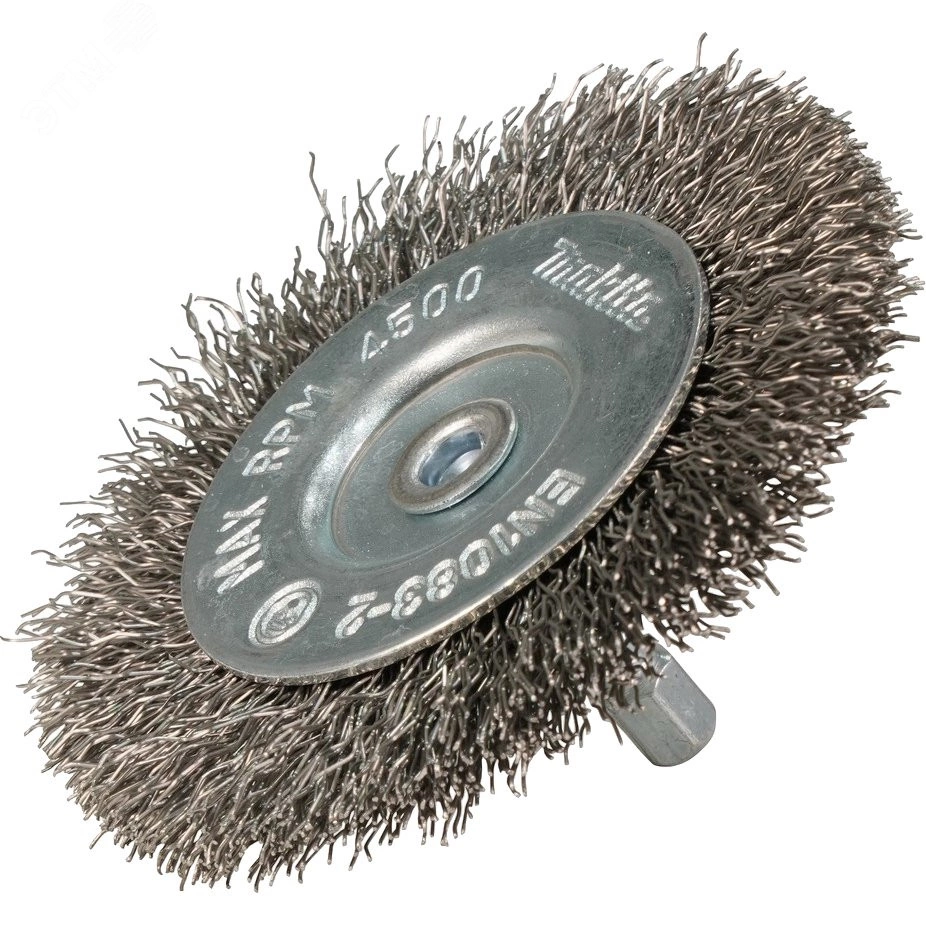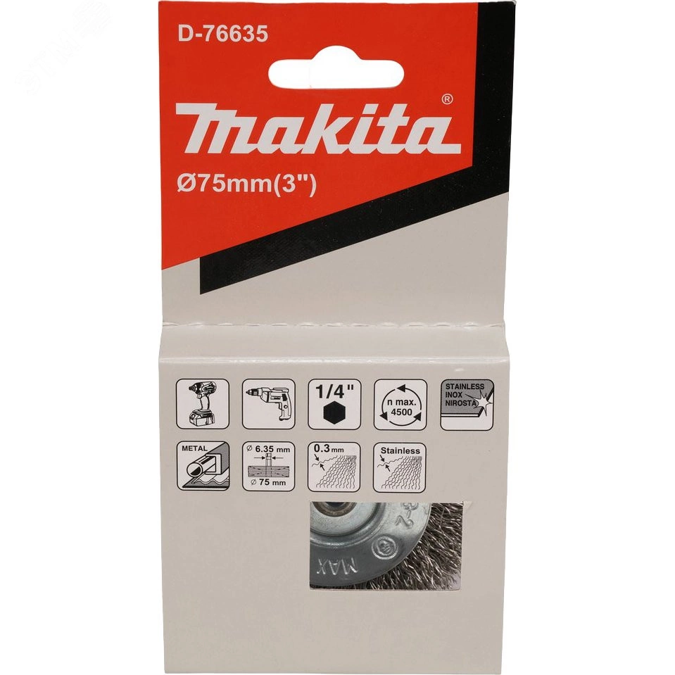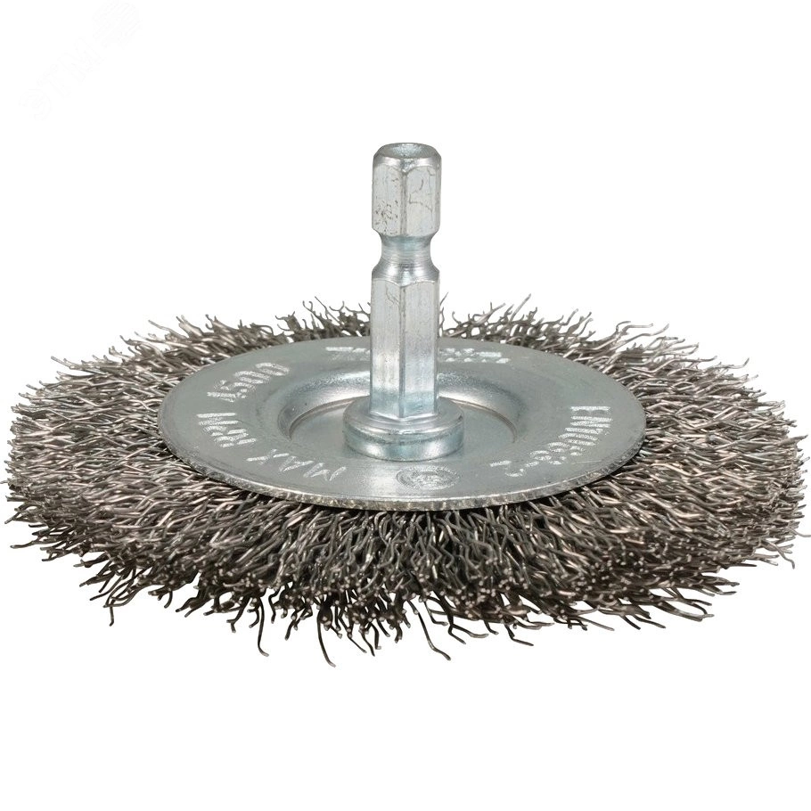 Щетка проволочная дисковая (d75 мм, толщина проволоки 0.3 мм, гофрированная, нержавеющая сталь, 1/4'')