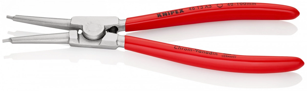46 13 A3 Щипцы для стопорных колец прочные, кованые. нескользящие, прочные наконечники. прямые концы. DIN 5254 A, прямые концы. - Диапазон диаметров валов - 40?–?100mm - Наконечники (диаметр) - 2,3mm
