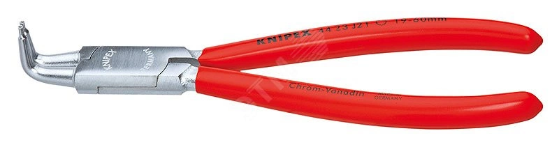 44 23 J31 Щипцы для стопорных колец прочные, кованые. нескользящие, прочные наконечники. изогнутые концы. DIN 5256 D, изогнутые под углом 90° концы. - Диапазон диаметров отверстий - 40?–?100mm - Наконечники (диаметр) - 2,3mm