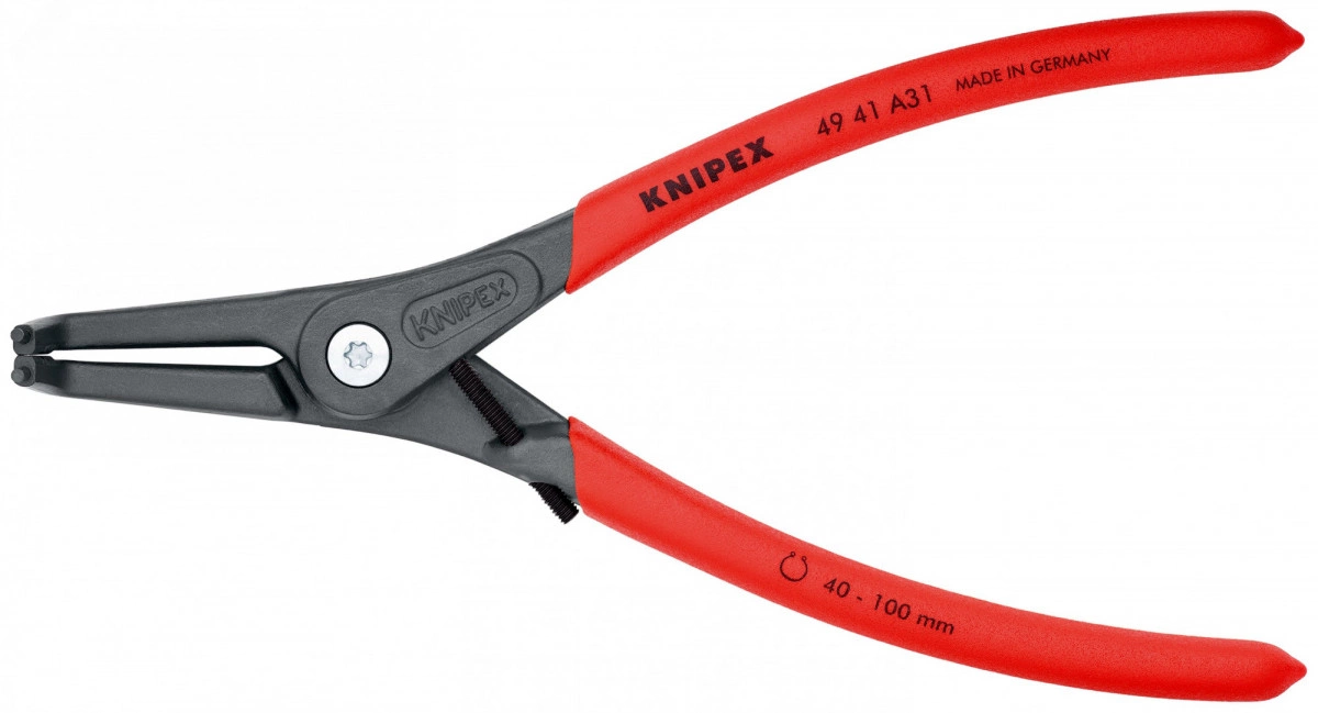 Прецизионные щипцы для стопорных колец C высокой нагрузочной способностью в условиях длительного применения - срок службы дольше до 10 раз по сравнению с обточенными наконечниками. c запрессованными наконечниками для безопасной работы. высоко нагруженные, для продолжительных работ. прецизионный винтовой шарнир с легким ходом. кованые. большие контактные поверхности наконечников. без перекоса колец, легкий монтаж. удлиненная головка щипцов для оптимального доступа к детали. внутренняя пружина, защищенная от загрязнения или ее утери. Ручки, покрытые противоскользящим пластиком. DIN 5254 В. изогнутые под углом 90 концы. со специальным ограничителем раскрытия наконечников для установки стопорных колец по стандарту DIN 471. регулируемый винтовой упор защищает стопорные кольца от чрезмерного раскрытия. Диапазон диаметров валов - диаметр 40?-?100