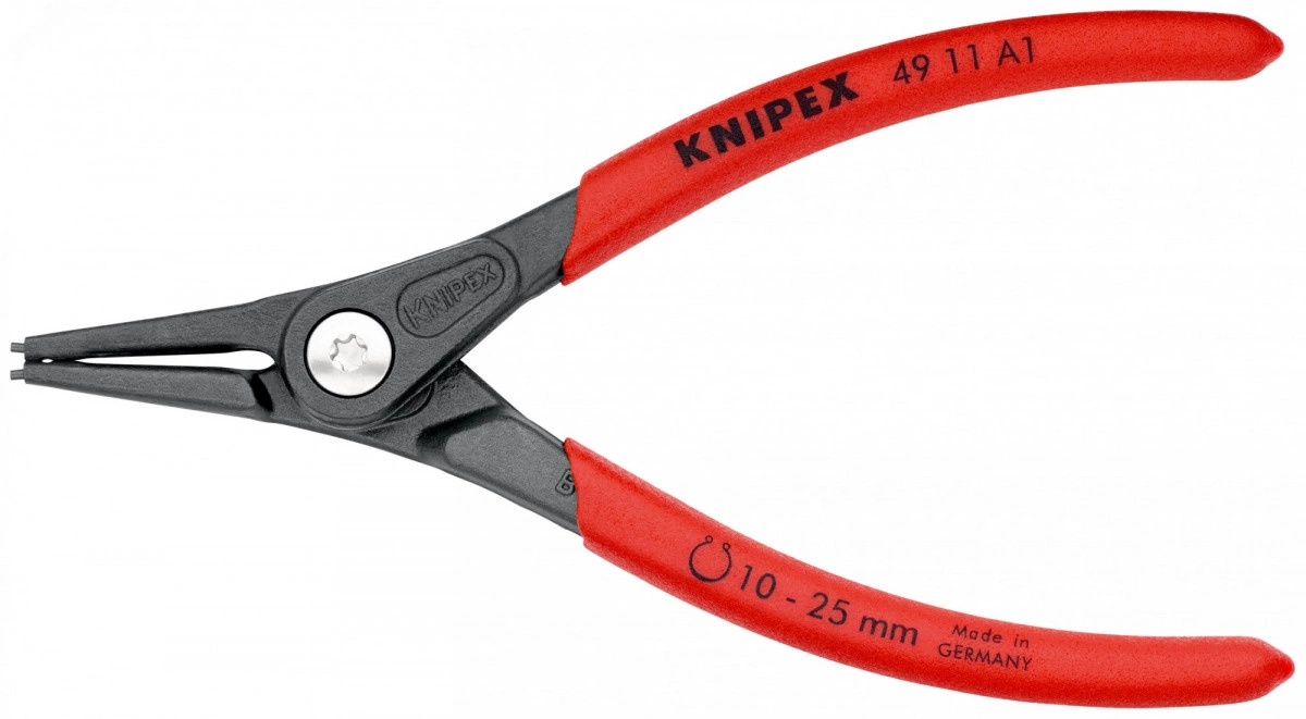 49 11 A1 SB Прецизионные щипцы для стопорных колец C высокой нагрузочной способностью в условиях длительного применения - срок службы дольше до 10 раз по сравнению с обточенными наконечниками. c запрессованными наконечниками для безопасной работы. большие контактные поверхности наконечников - без перекоса колец, легкий монтаж. винтовой шарнир - точный ход без люфта. внутренняя пружина, защищенная от загрязнения или ее утери. ручки с покрытием из нескользящего пластика. прямые концы. карта самообслуживания/ блистер. - Диапазон диаметров валов - 10?–?25mm - Наконечники (диаметр) - 1,3mm