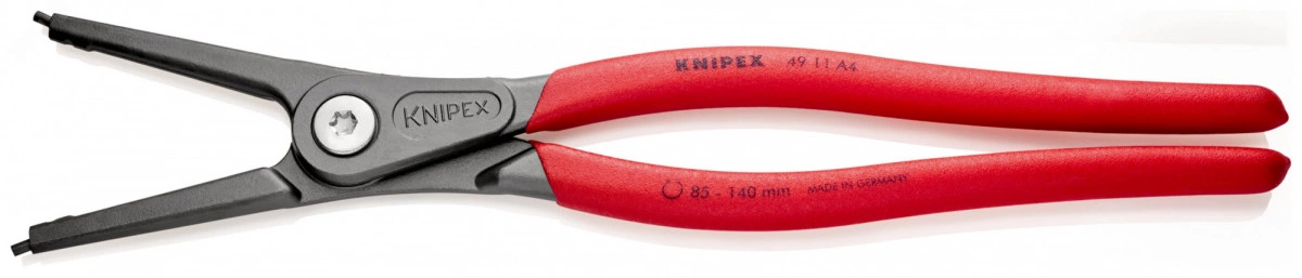 49 11 A4 Прецизионные щипцы для стопорных колец C высокой нагрузочной способностью в условиях длительного применения - срок службы дольше до 10 раз по сравнению с обточенными наконечниками. c запрессованными наконечниками для безопасной работы. большие контактные поверхности наконечников - без перекоса колец, легкий монтаж. винтовой шарнир - точный ход без люфта. внутренняя пружина, защищенная от загрязнения или ее утери. ручки с покрытием из нескользящего пластика. прямые концы. карта самообслуживания/ блистер. - Диапазон диаметров валов - 85?–?140mm - Наконечники (диаметр) - 3,2mm