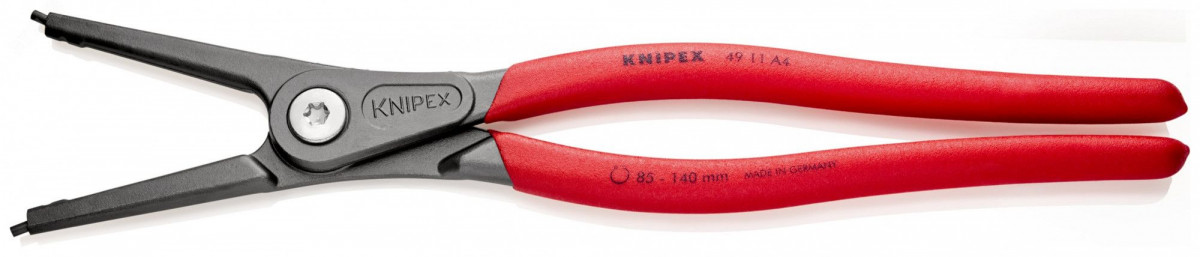 49 11 A4 SB Прецизионные щипцы для стопорных колец C высокой нагрузочной способностью в условиях длительного применения - срок службы дольше до 10 раз по сравнению с обточенными наконечниками. c запрессованными наконечниками для безопасной работы. большие контактные поверхности наконечников - без перекоса колец, легкий монтаж. винтовой шарнир - точный ход без люфта. внутренняя пружина, защищенная от загрязнения или ее утери. ручки с покрытием из нескользящего пластика. прямые концы. карта самообслуживания/ блистер. - Диапазон диаметров валов - 85?–?140mm - Наконечники (диаметр) - 3,2mm